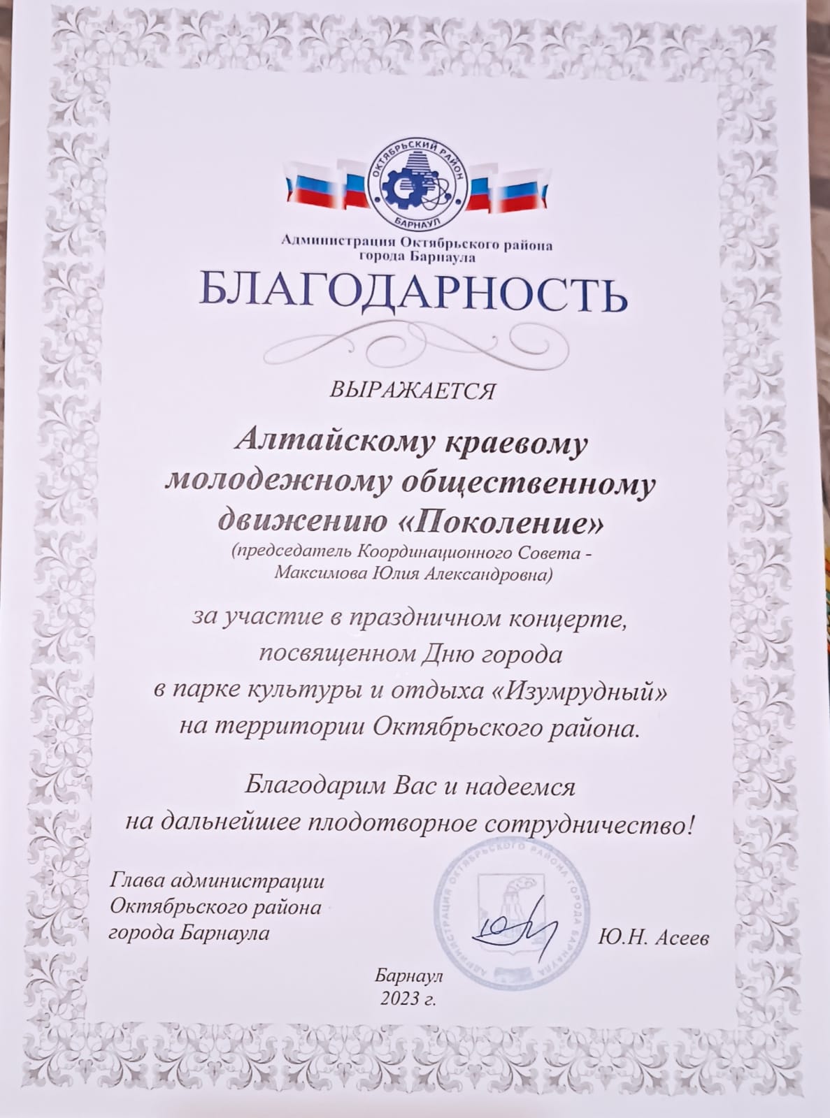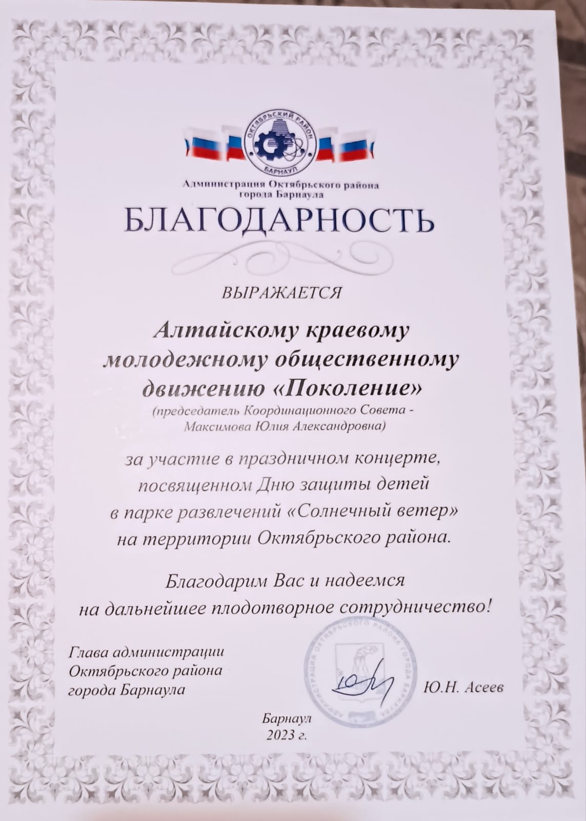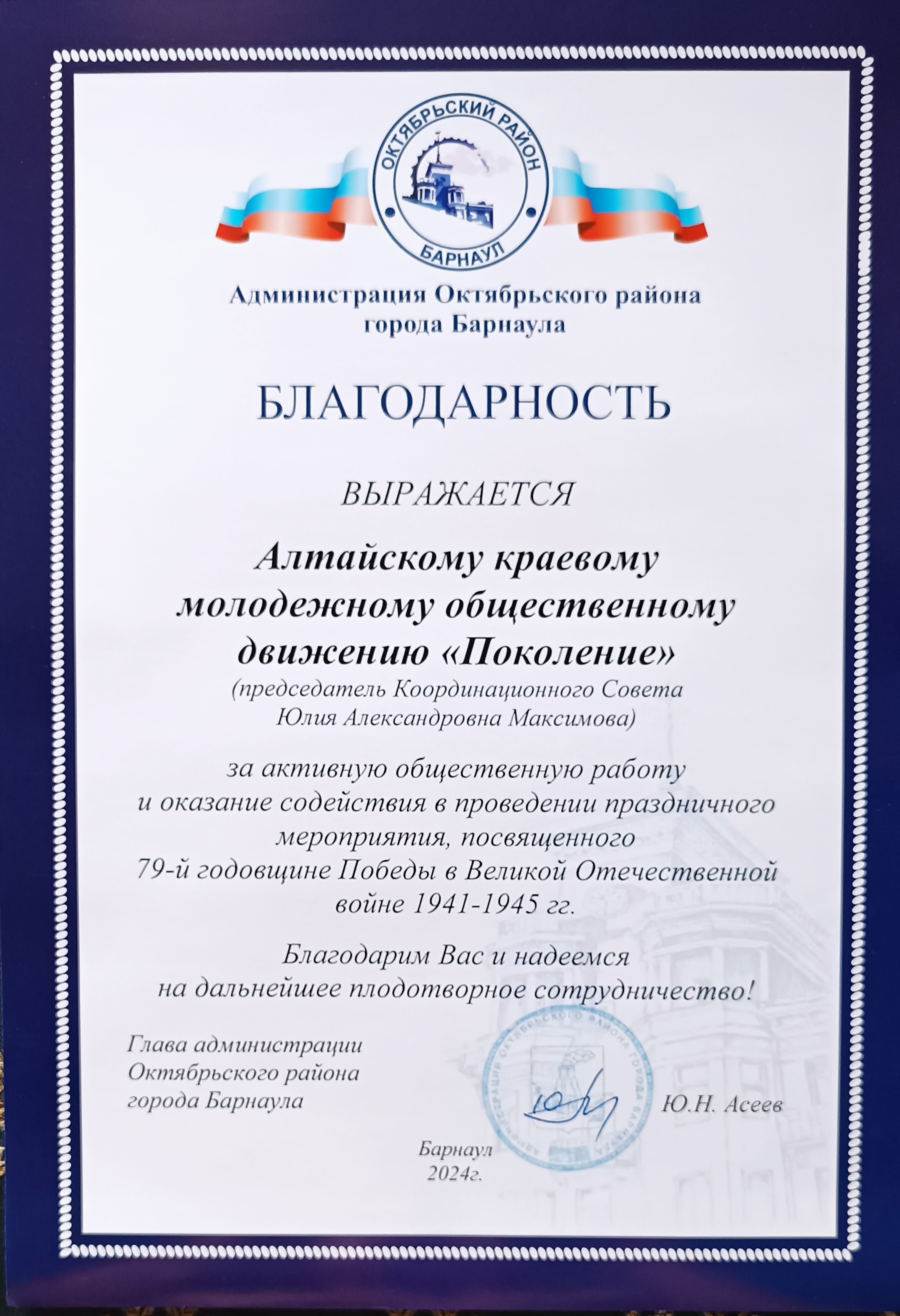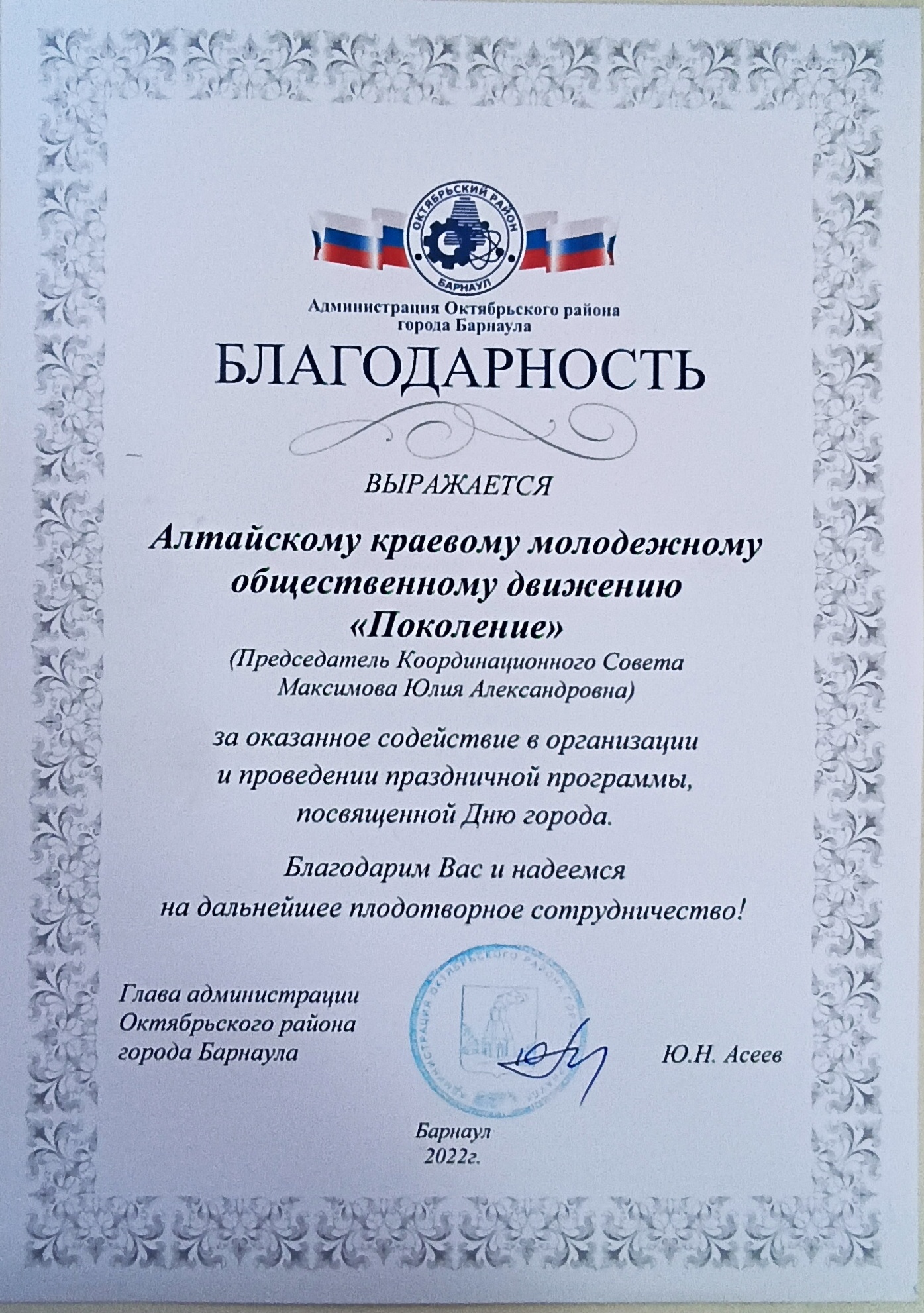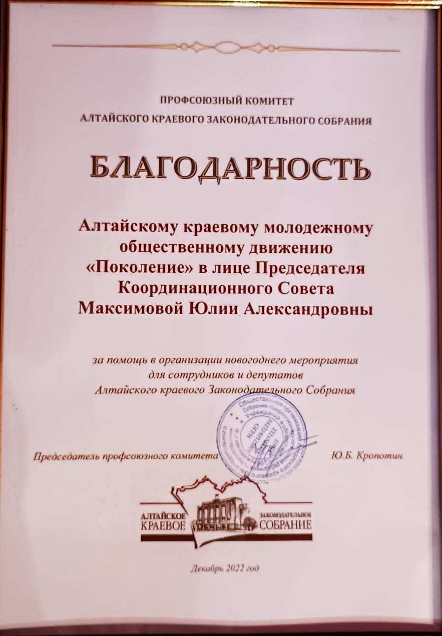 Благодарности, грамоты и сертификаты Алтайского краевого молодежного общественного движения «Поколение»