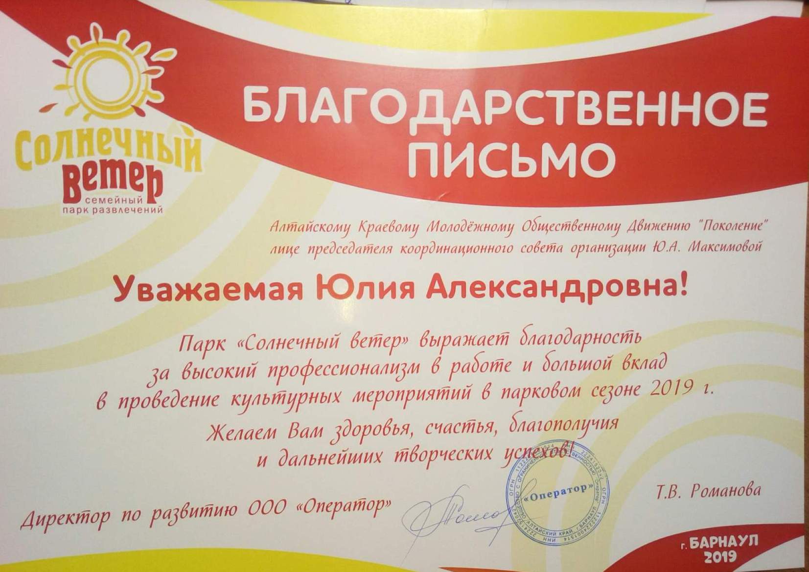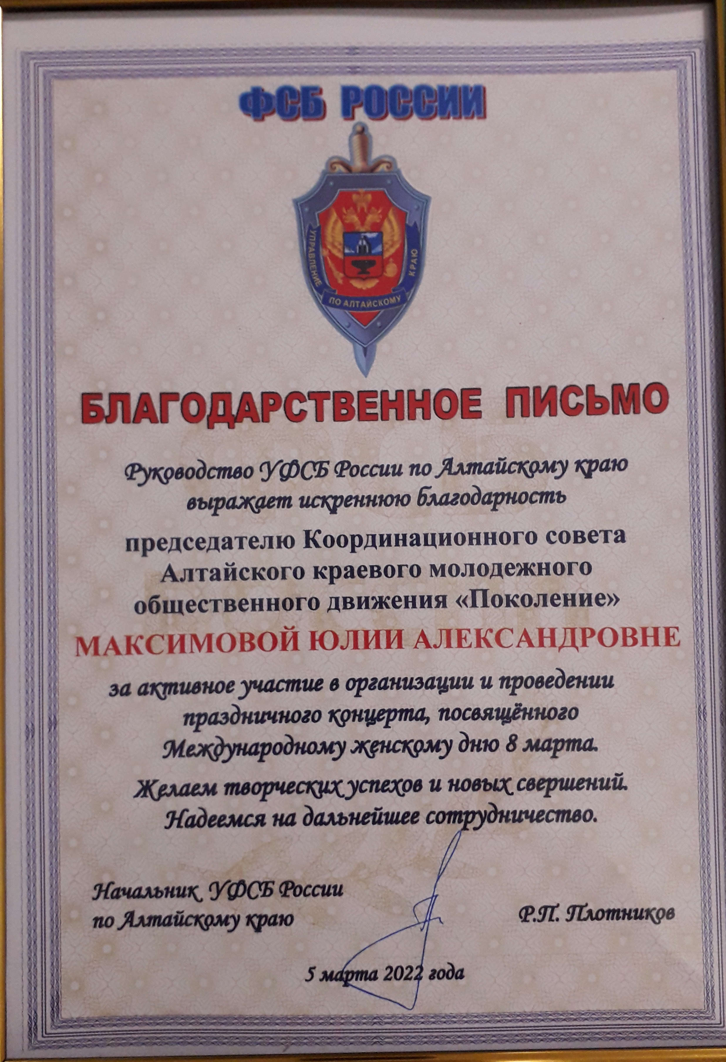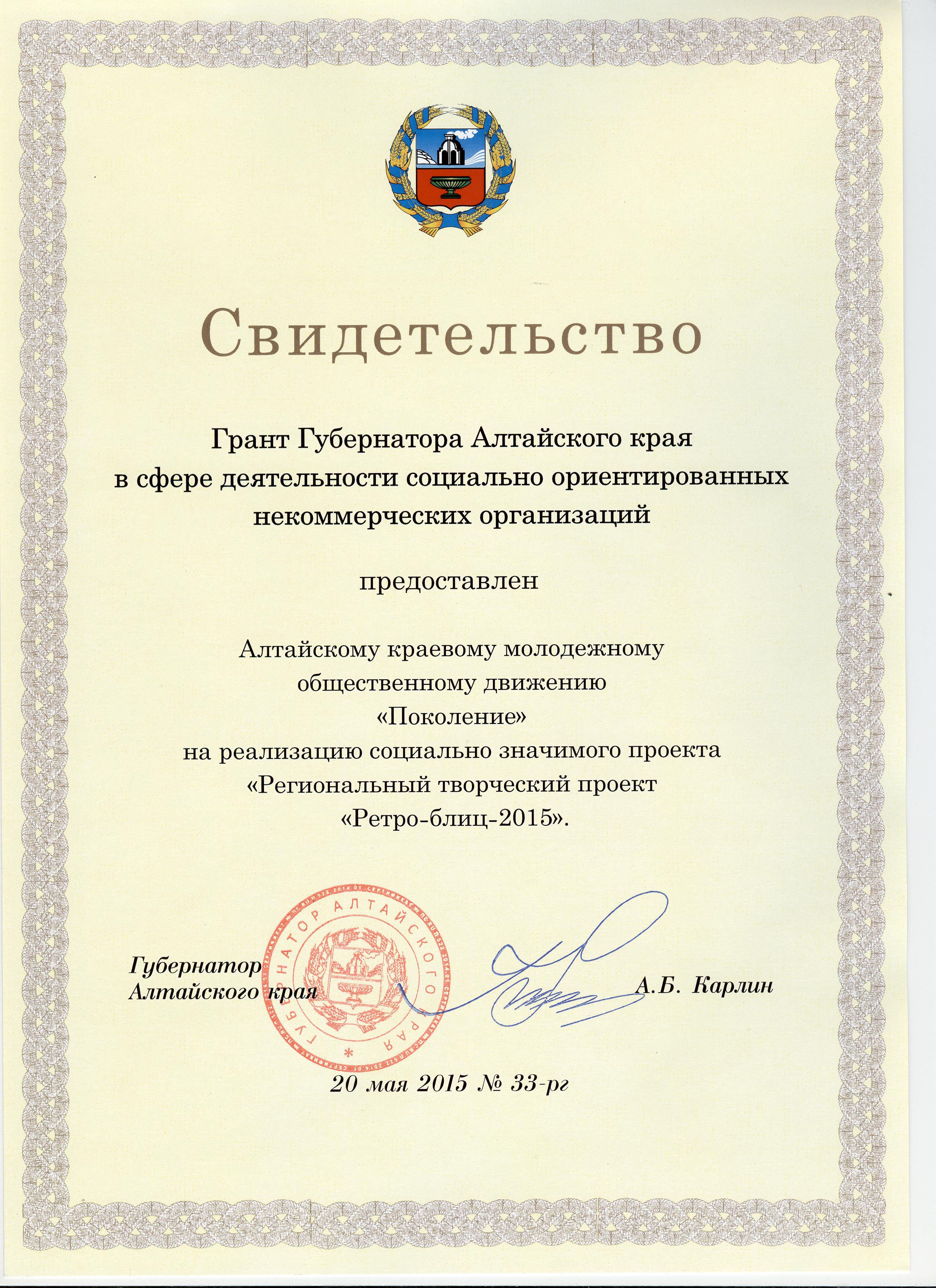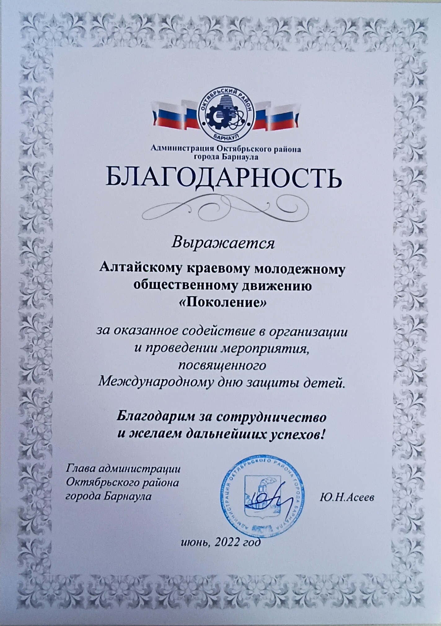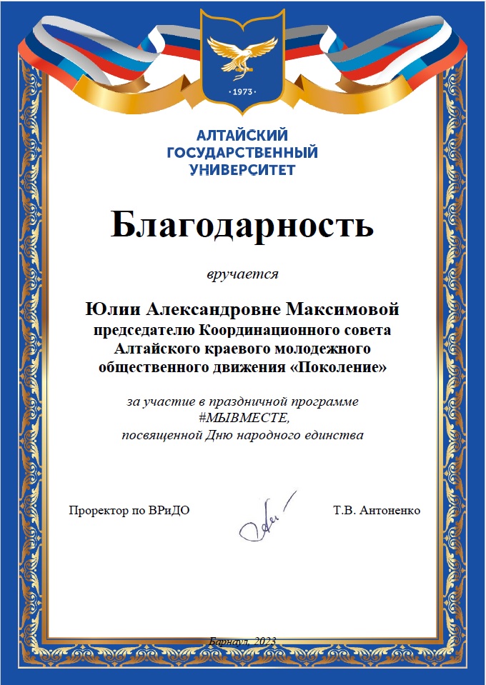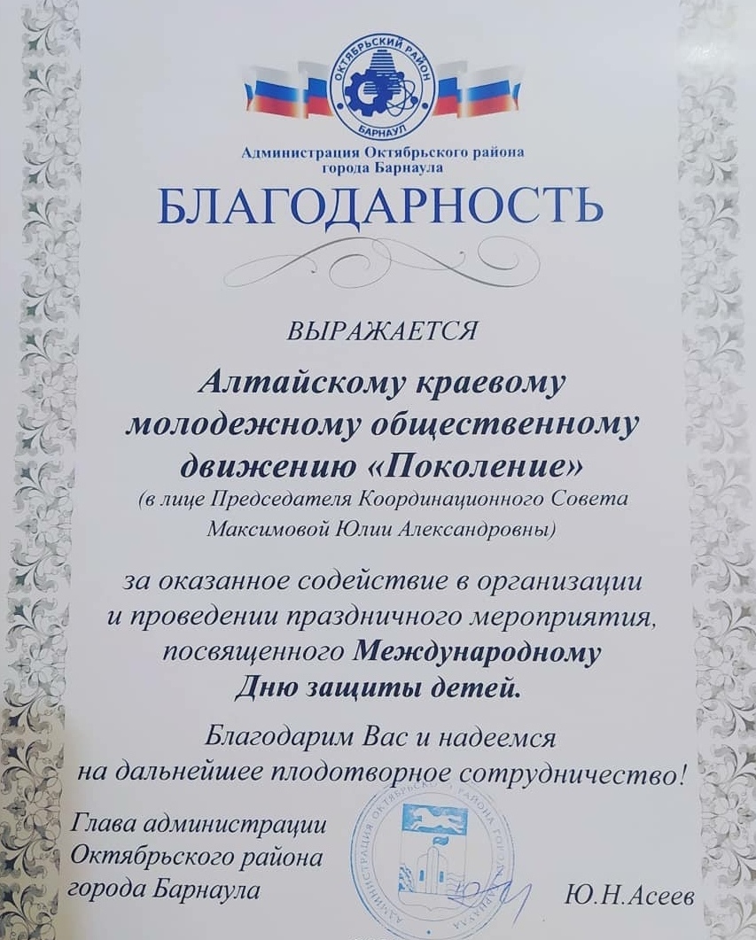 Благодарности, грамоты и сертификаты Алтайского краевого молодежного общественного движения «Поколение»