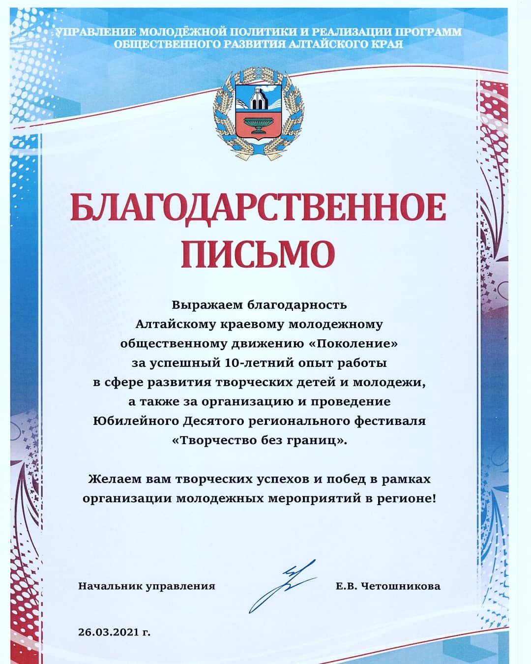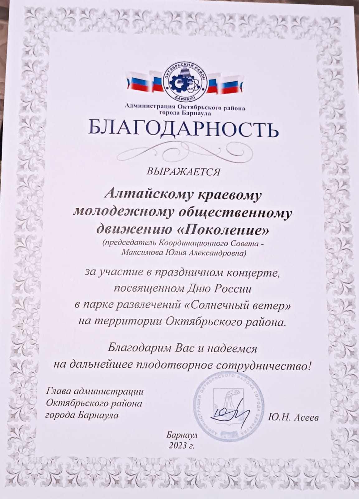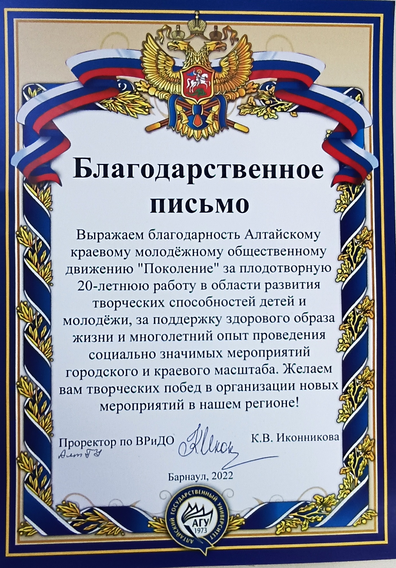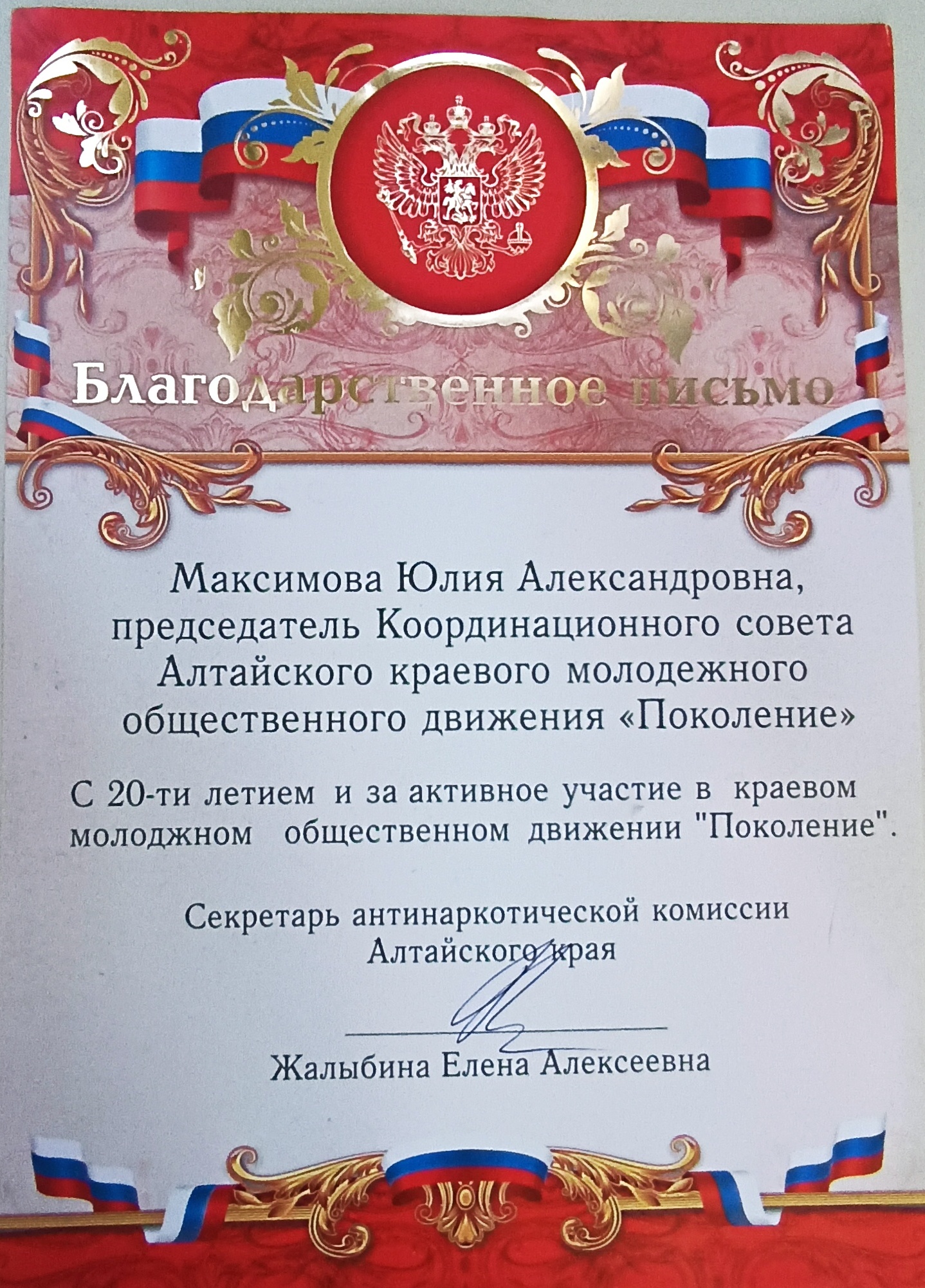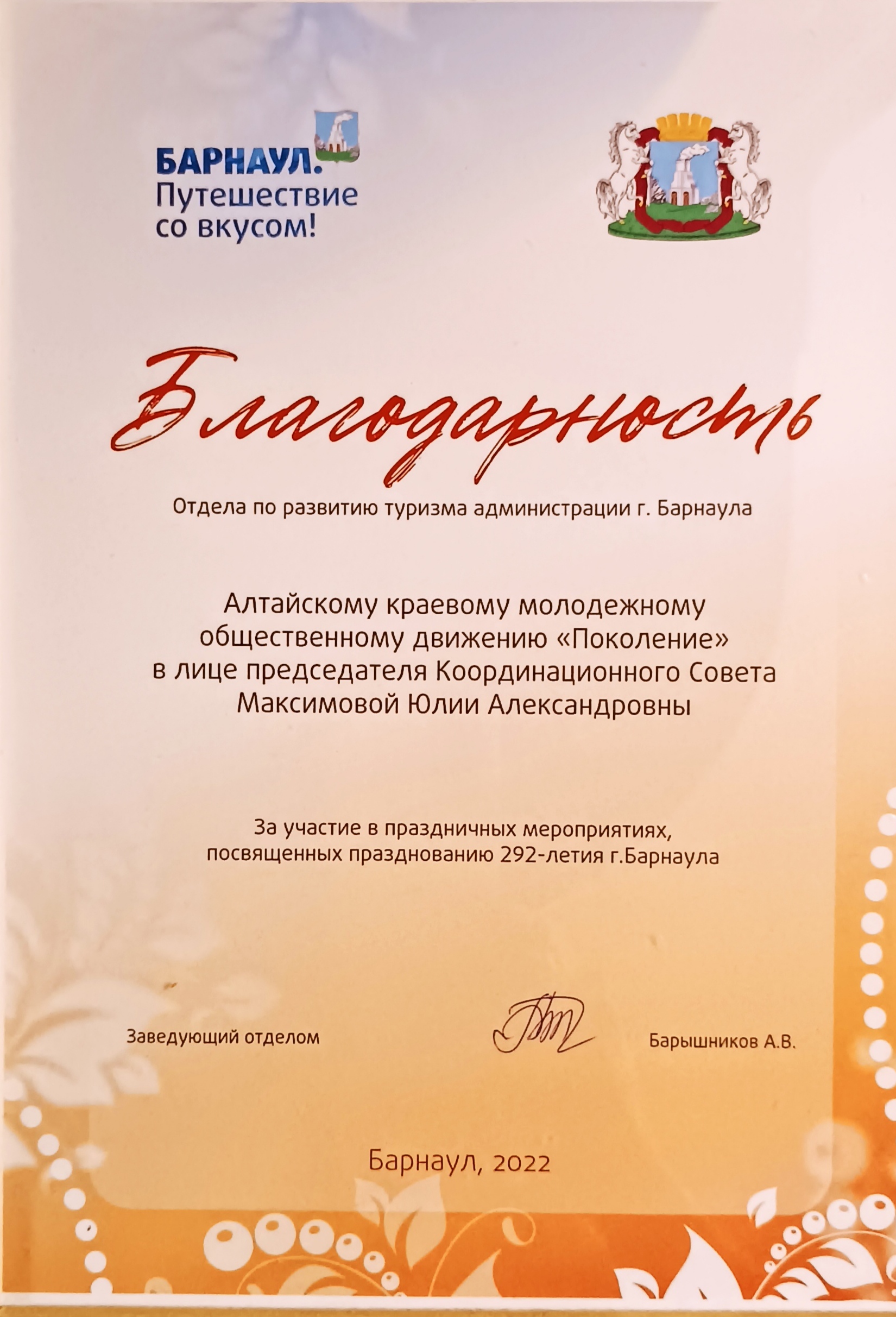 Благодарности, грамоты и сертификаты Алтайского краевого молодежного общественного движения «Поколение»