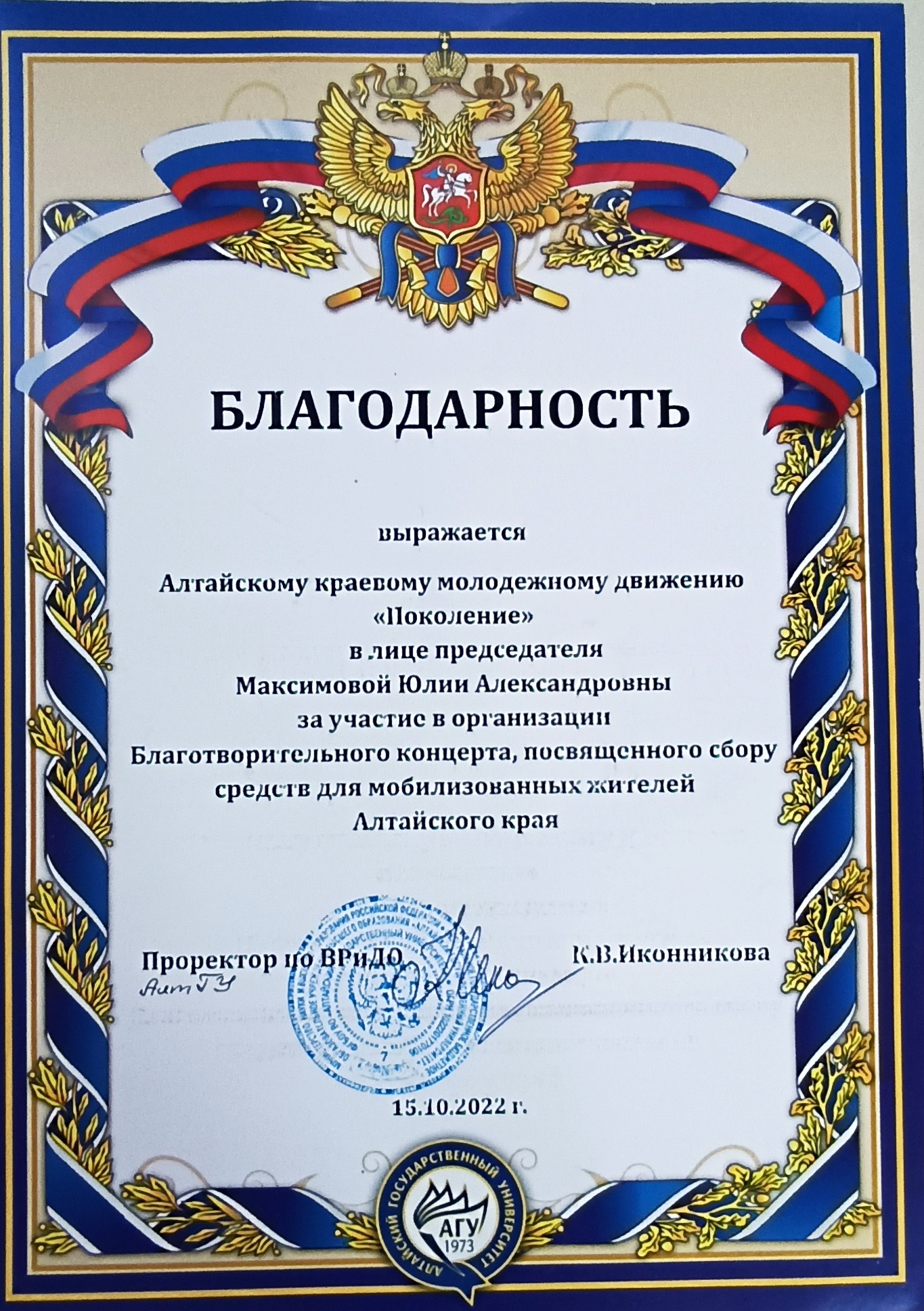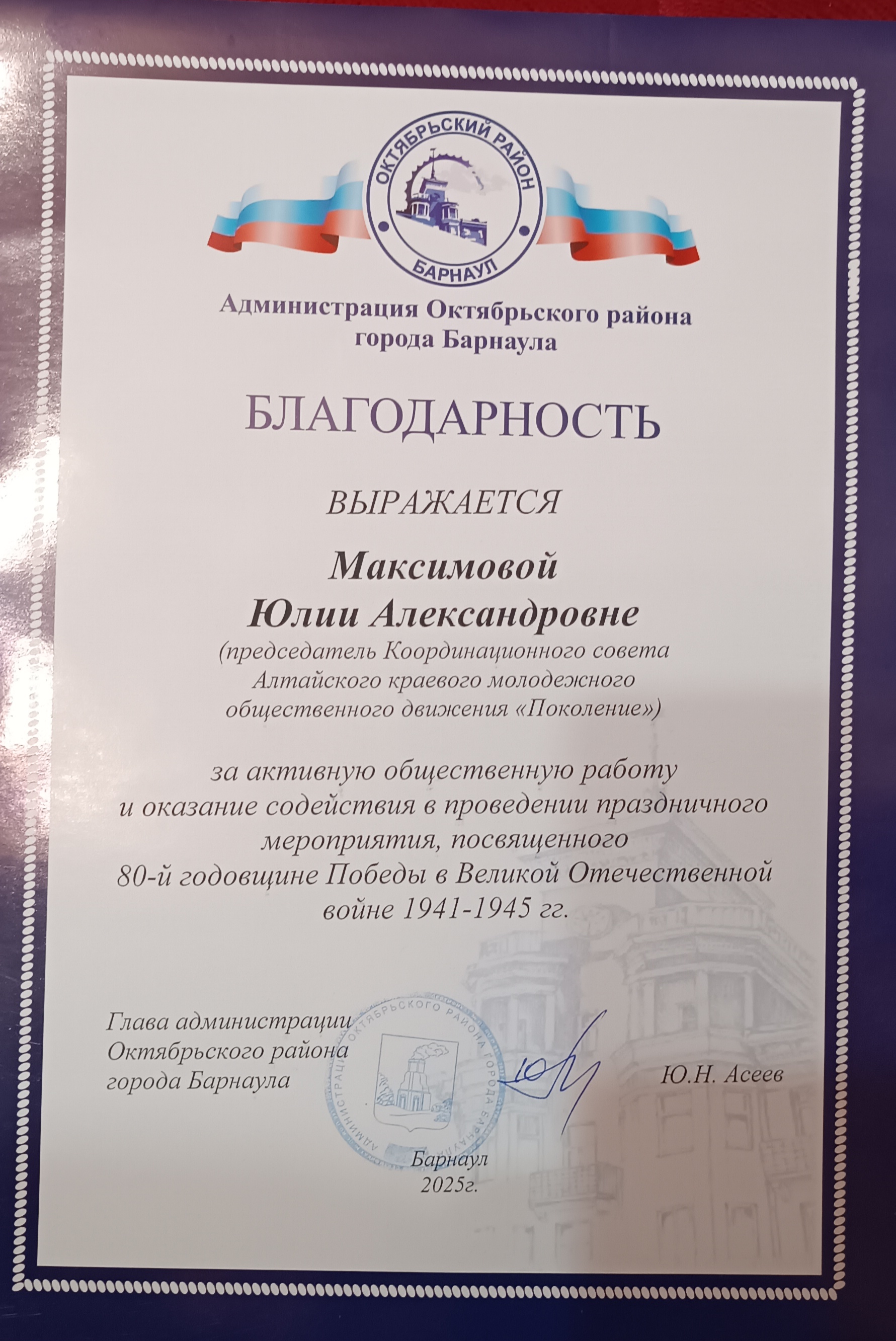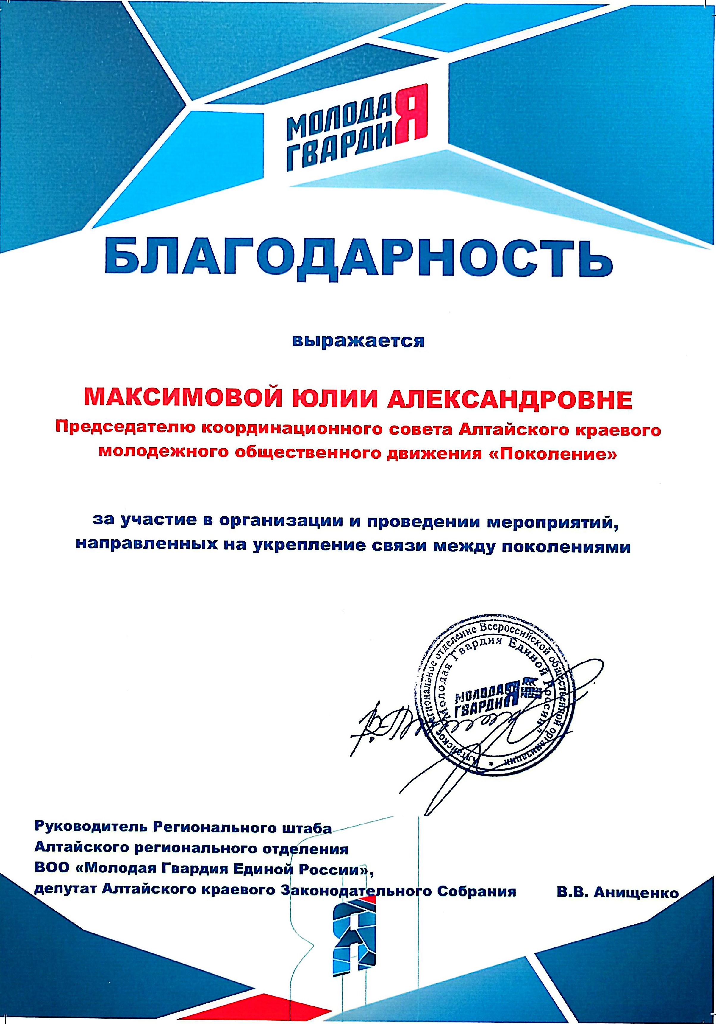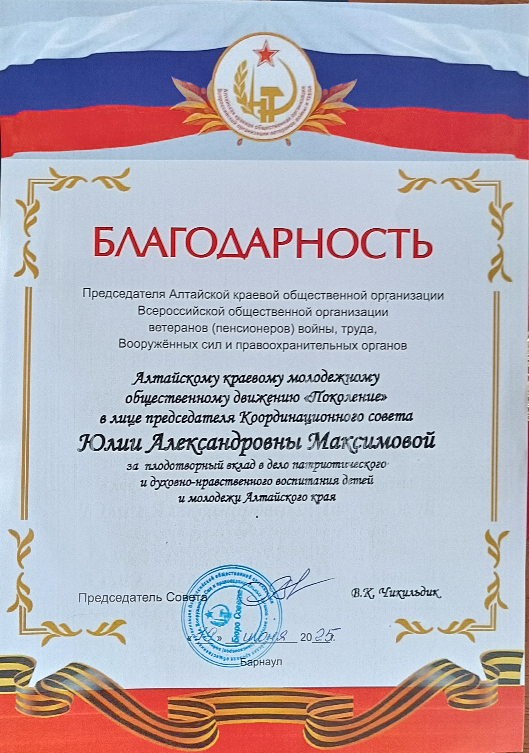 Благодарности, грамоты и сертификаты Алтайского краевого молодежного общественного движения «Поколение»