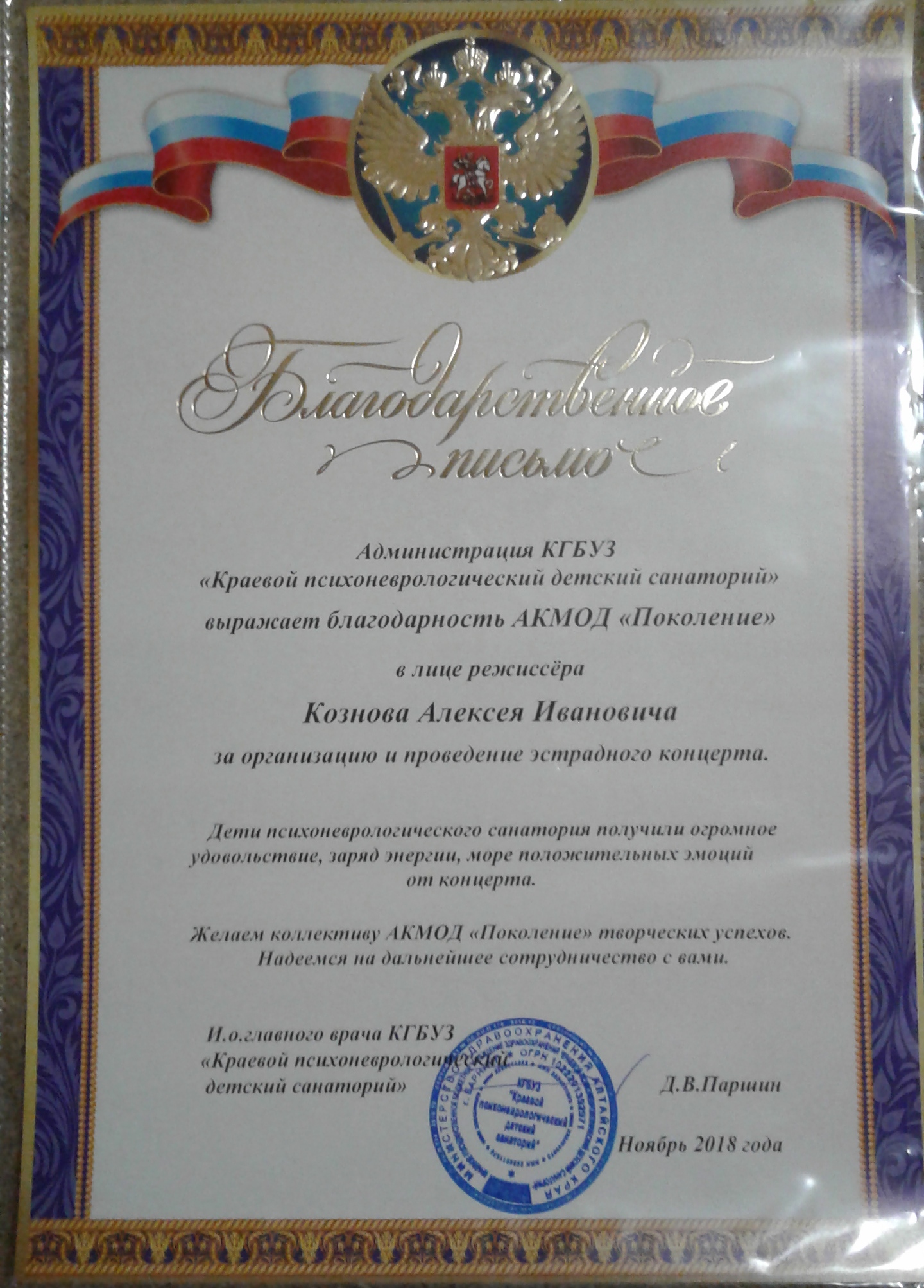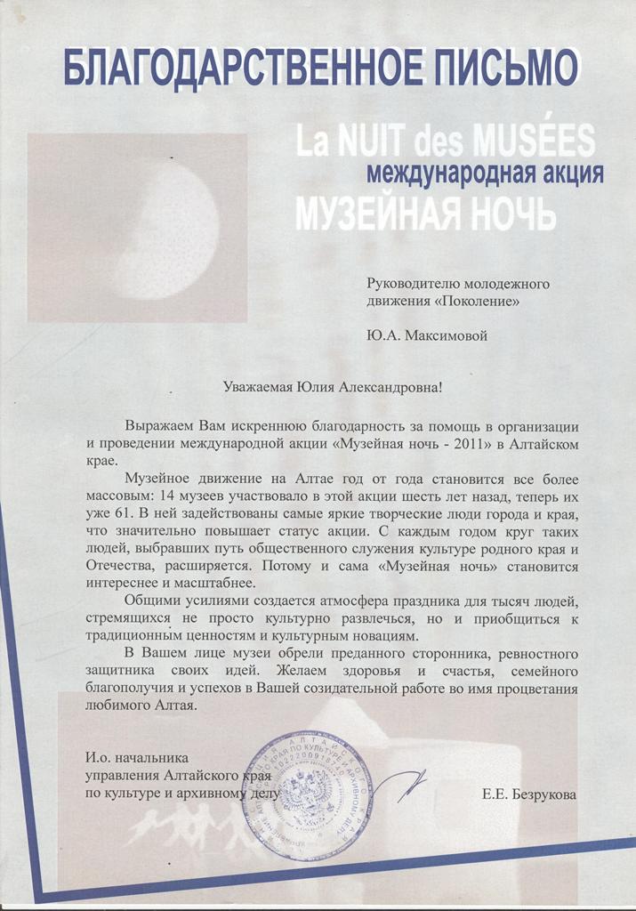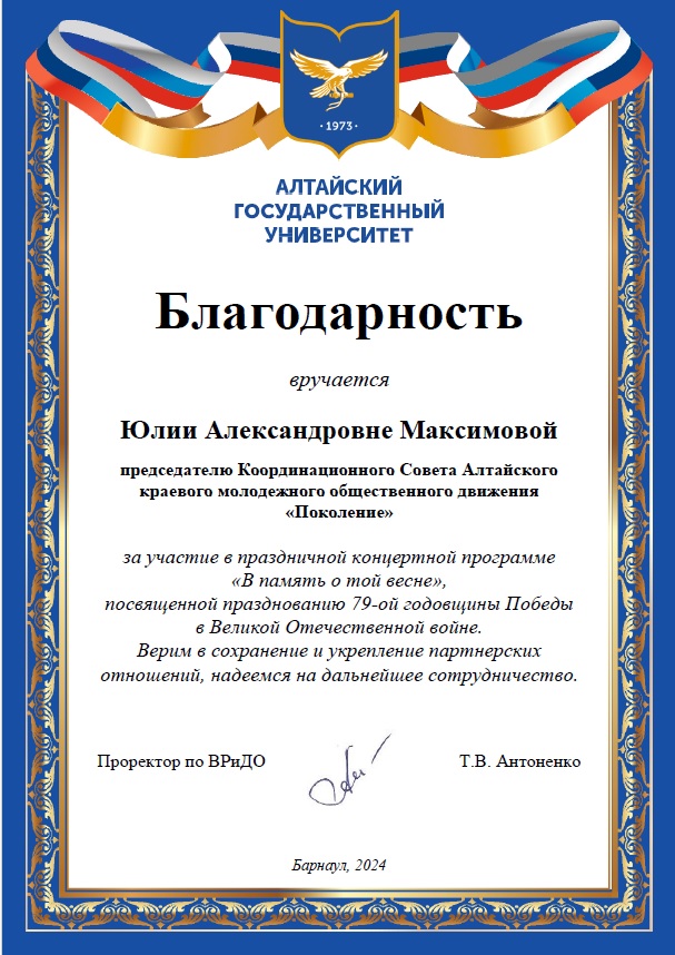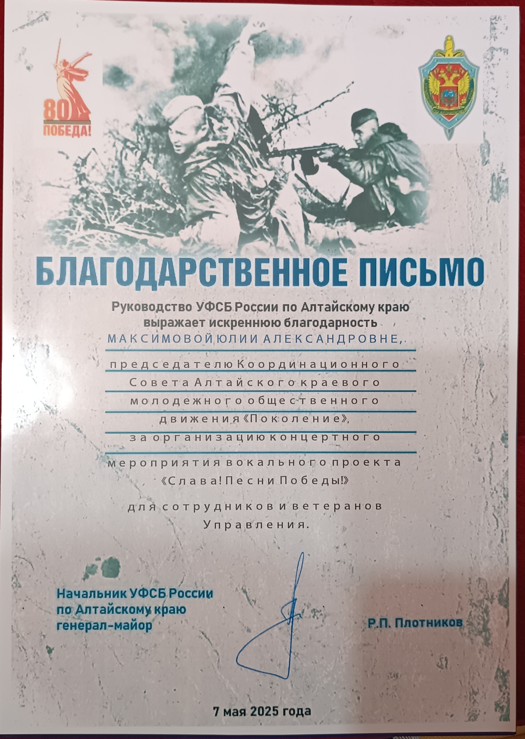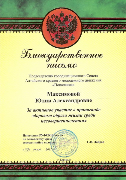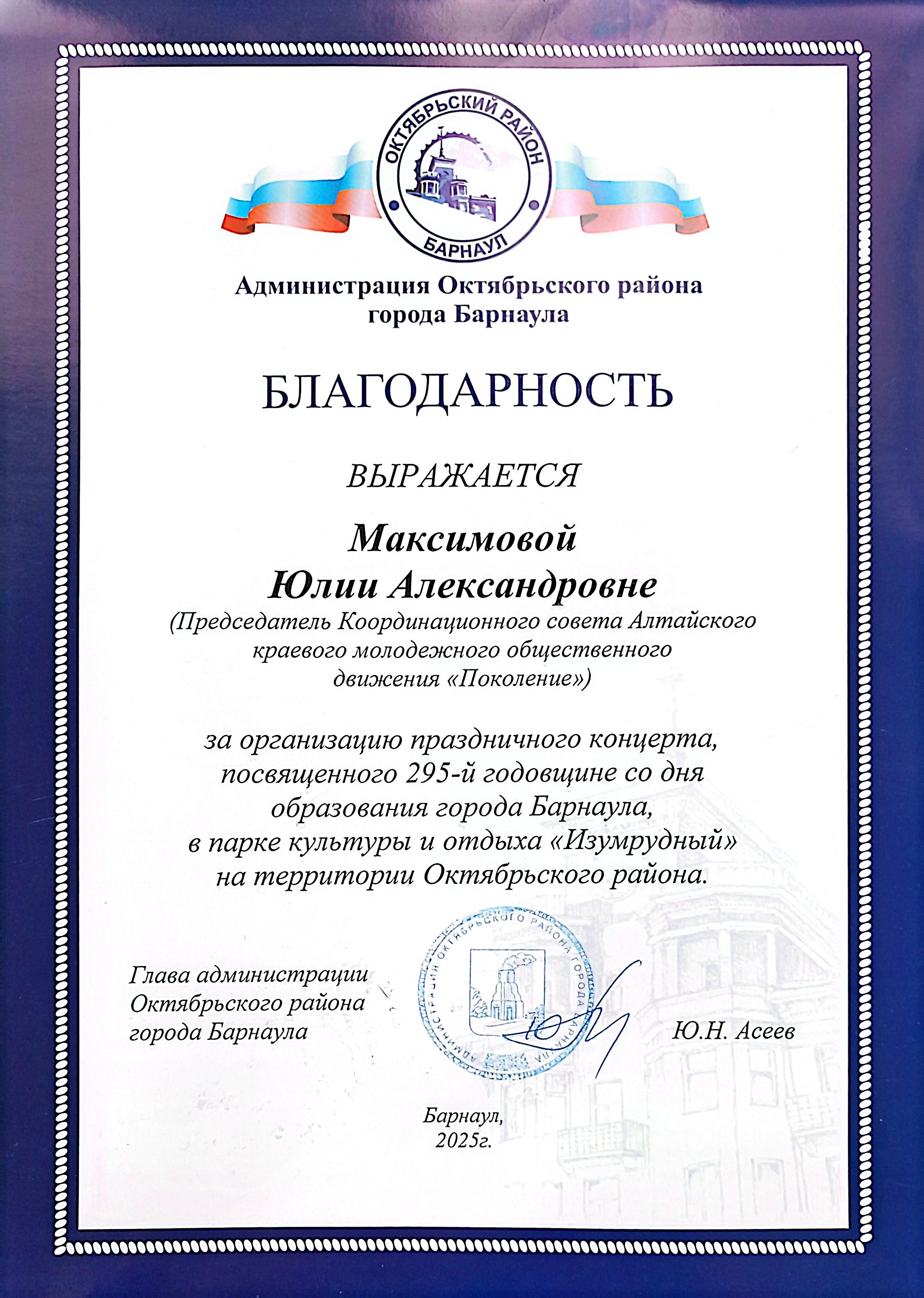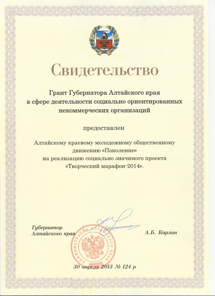 Благодарности, грамоты и сертификаты Алтайского краевого молодежного общественного движения «Поколение»